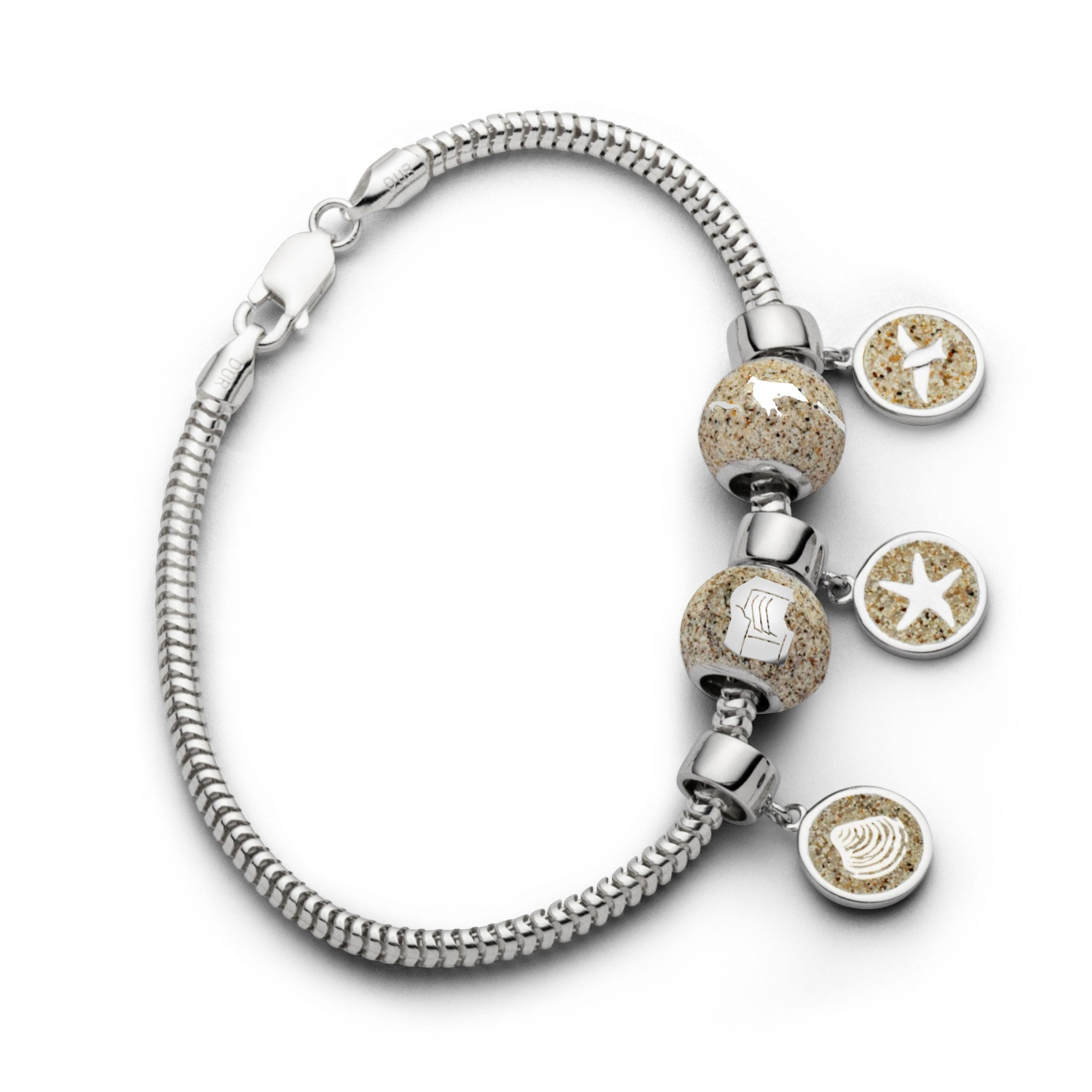 Sonne, Strand und Meer! Dieser kleine aber dennoch aussagekräftige Charm-Anhänger mit silbernem Motiv (Herz, Möwe, Kompass, Anker, Muschel oder Stern) und echtem Sand vom Strand zaubert Urlaubsmomente an Ihr Handgelenk und ist daher unverzichtbar für alle, die ein maritimes Statement setzen möchten.