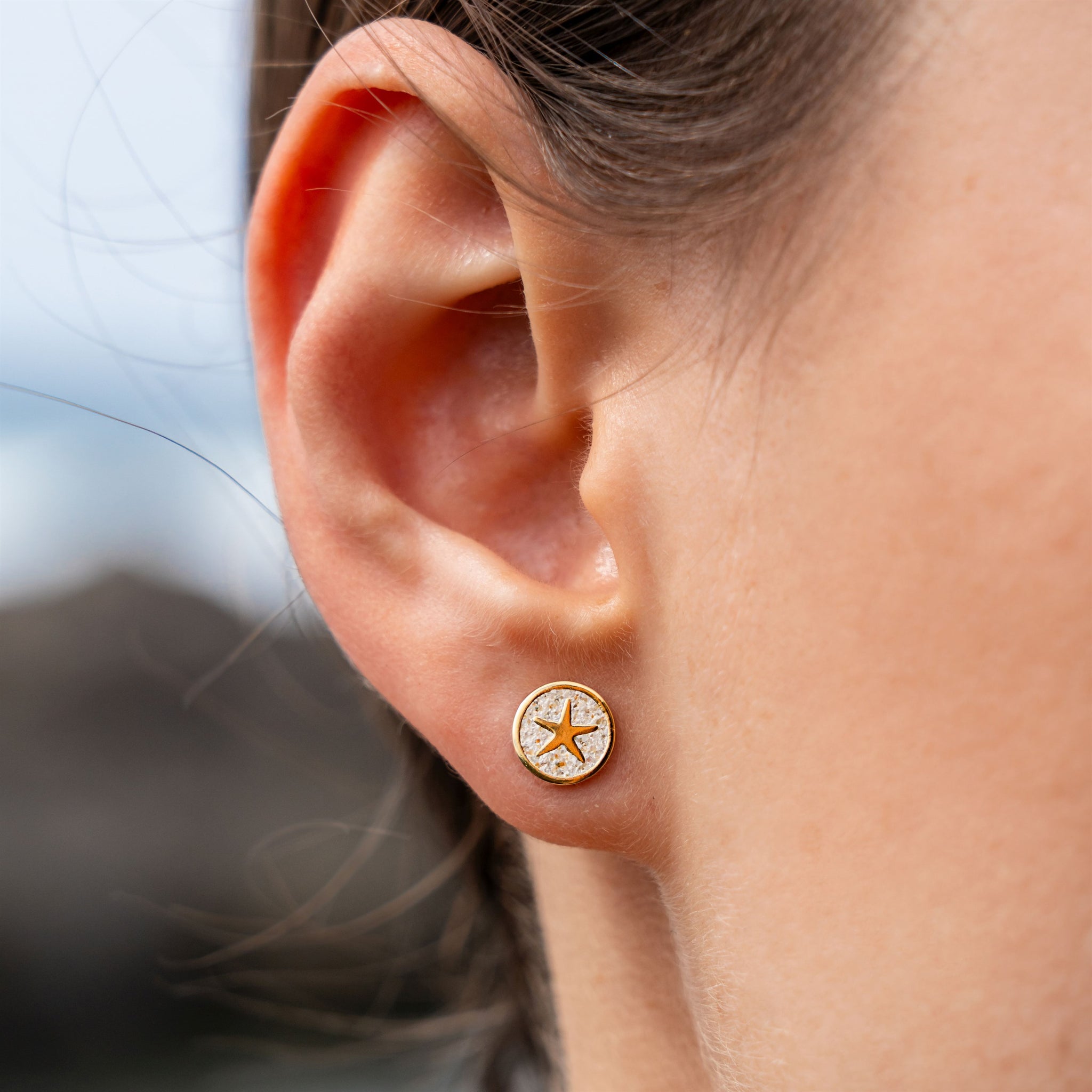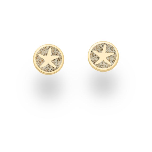 Ohrstecker "Seestern", kleiner runder Ohrstecker mit einem in Strandsand eingebetteten Stern, gefaßt in vergoldetem 925er Sterlingsilber.